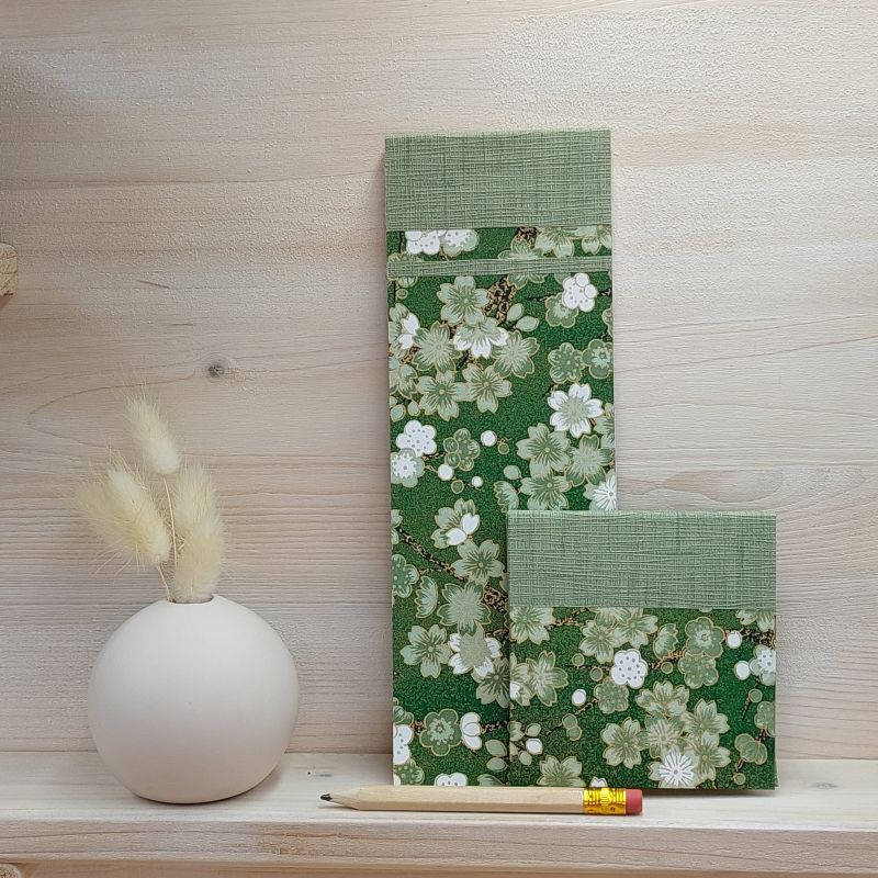 Bloc à listes, feuillets détachables, fleurs de sakura blanches et vert amande sur fond vert mousse